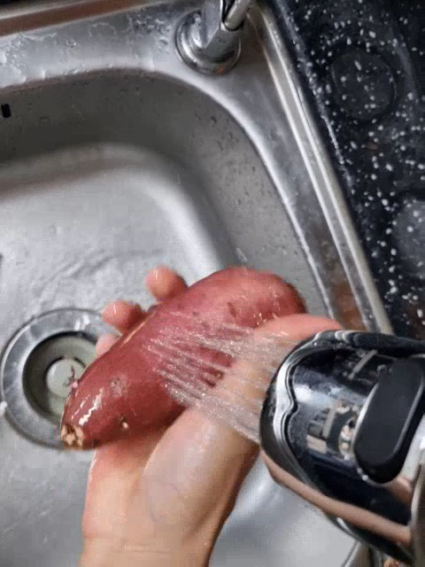 1. 흐르는 물에 고구마를 헹궈 줘요